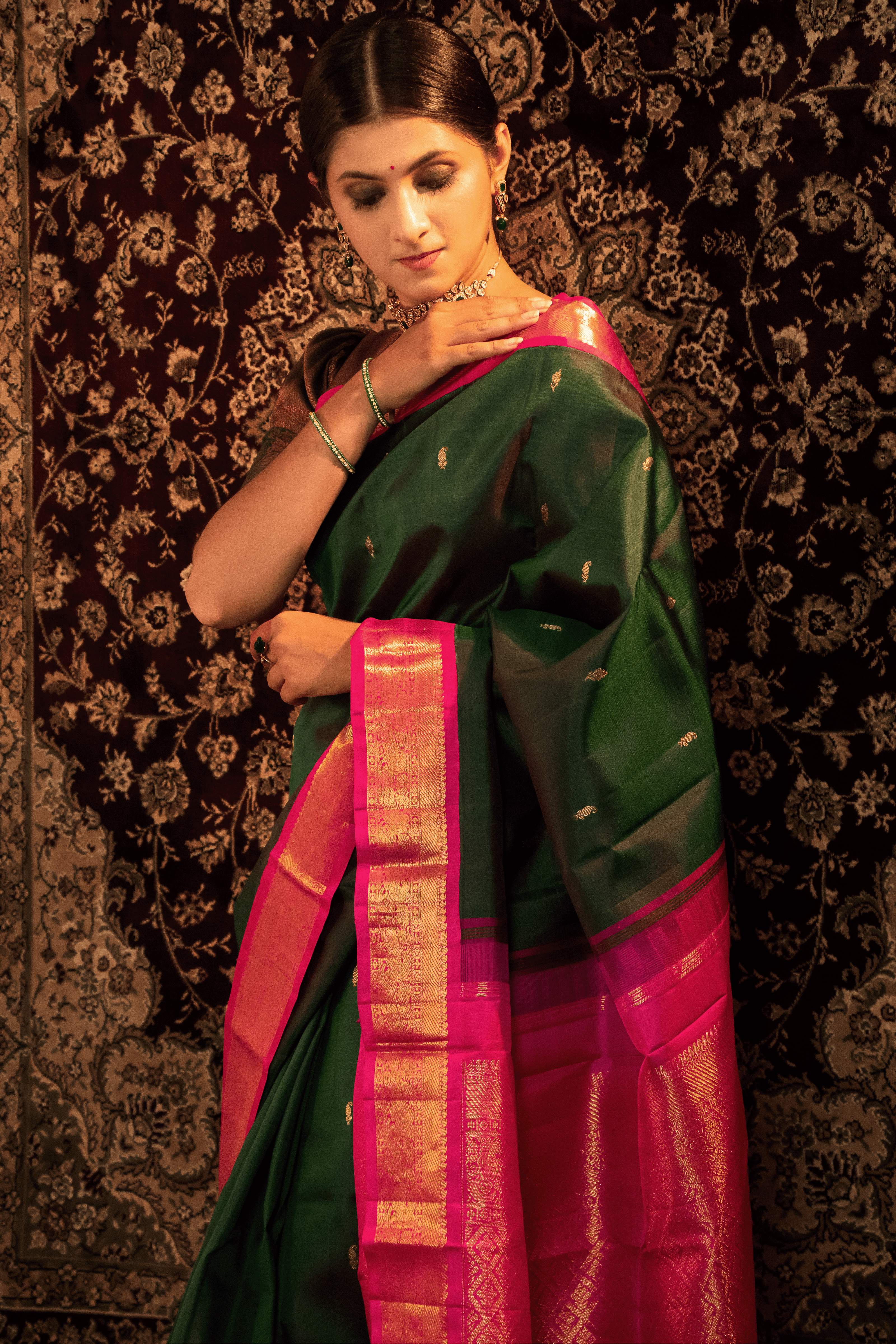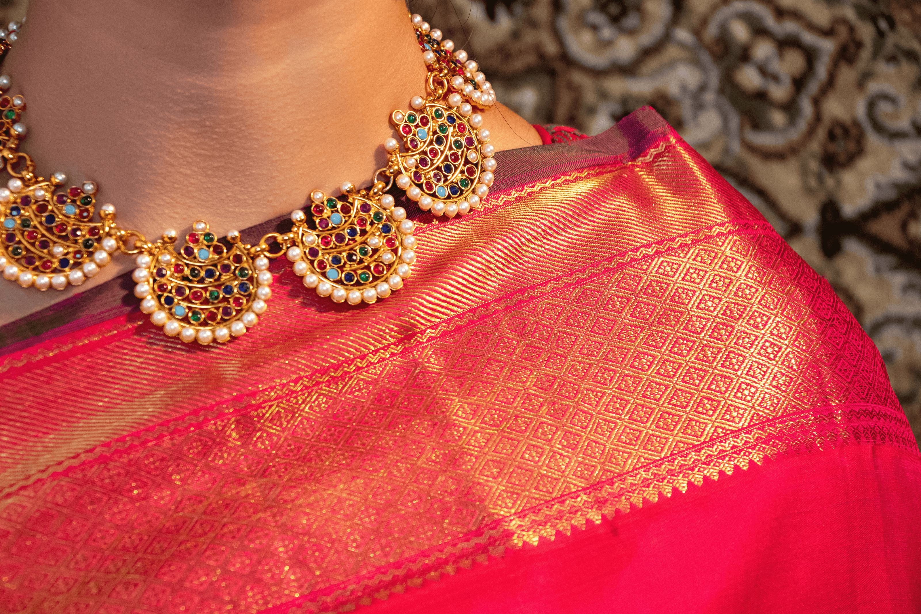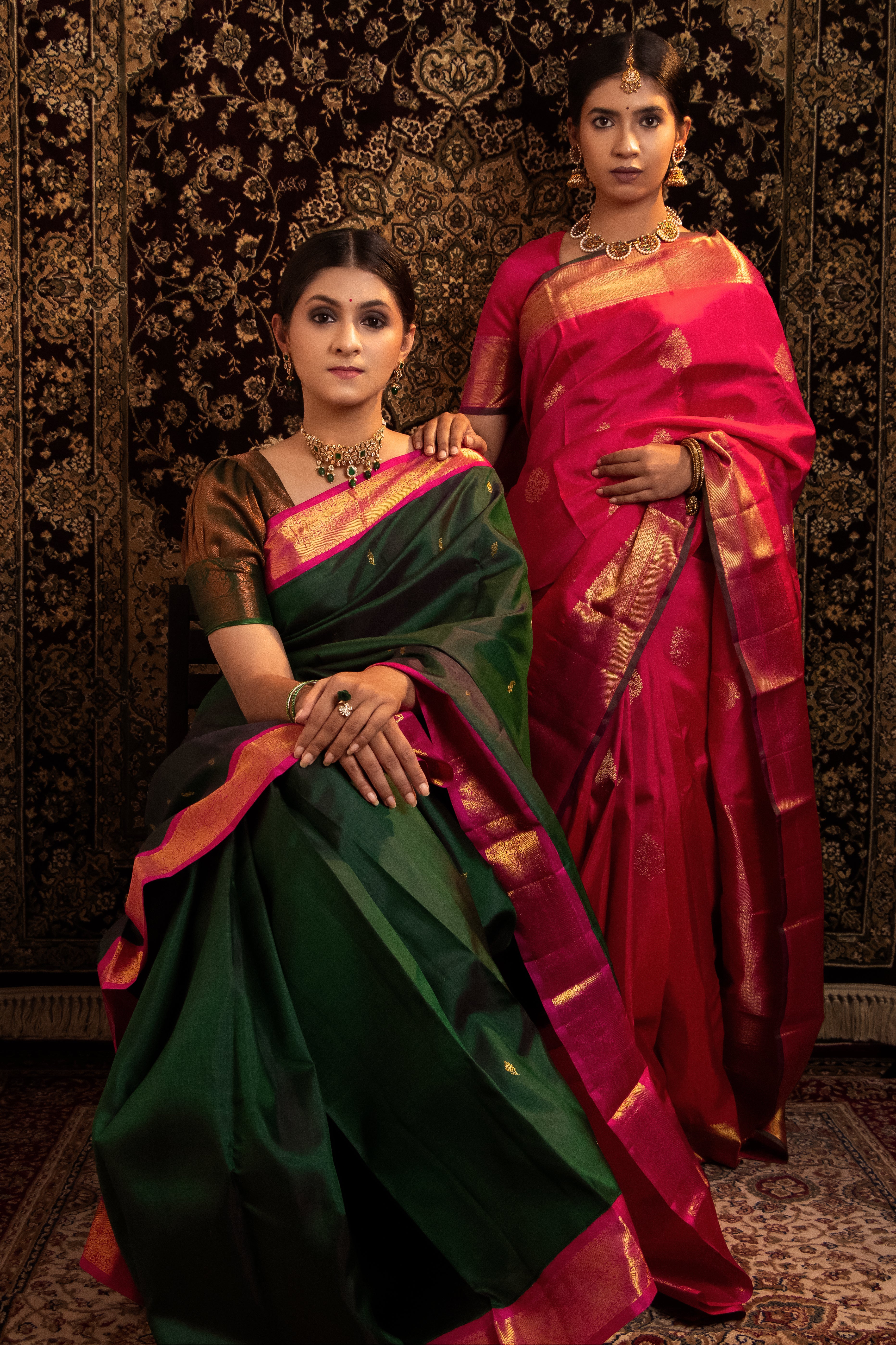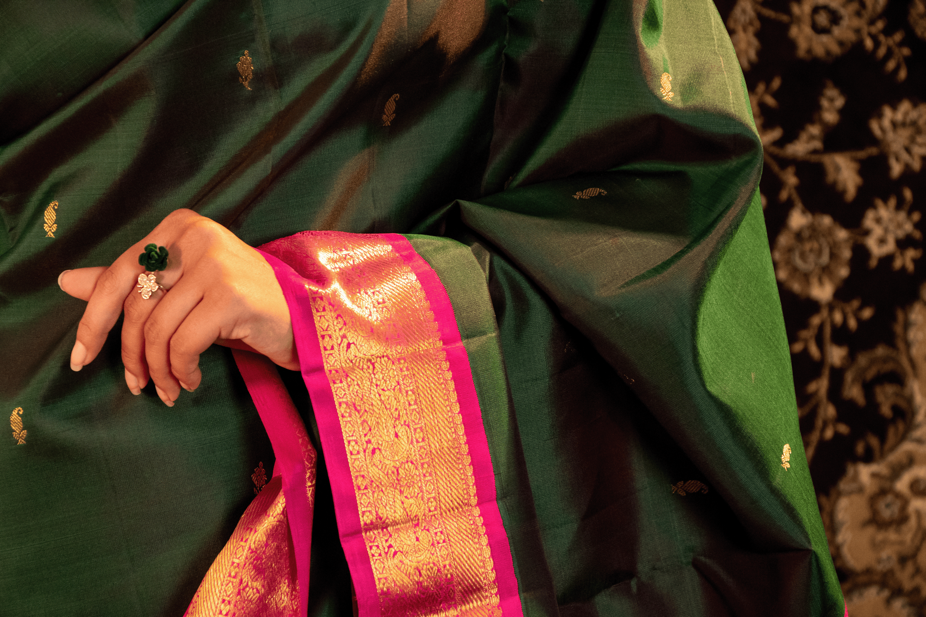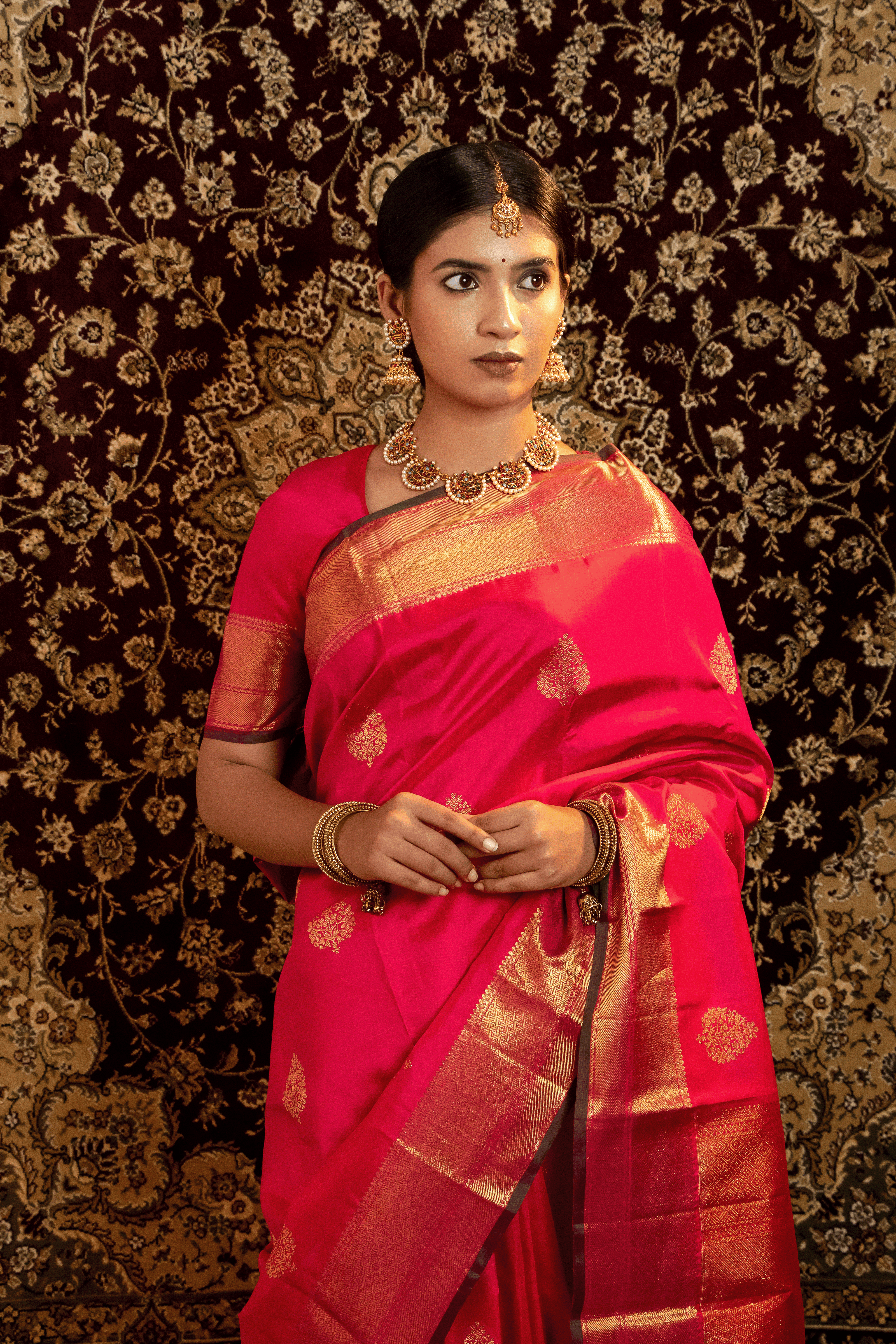 Each bridal weave at Vishitrang is conceived not as attire, but as a ceremony — a covenant between generations. Handwoven in Arni by generational artisans, these Kanjivarams carry within them the sanctity of ritual, the grace of heritage, and the promise of continuity.